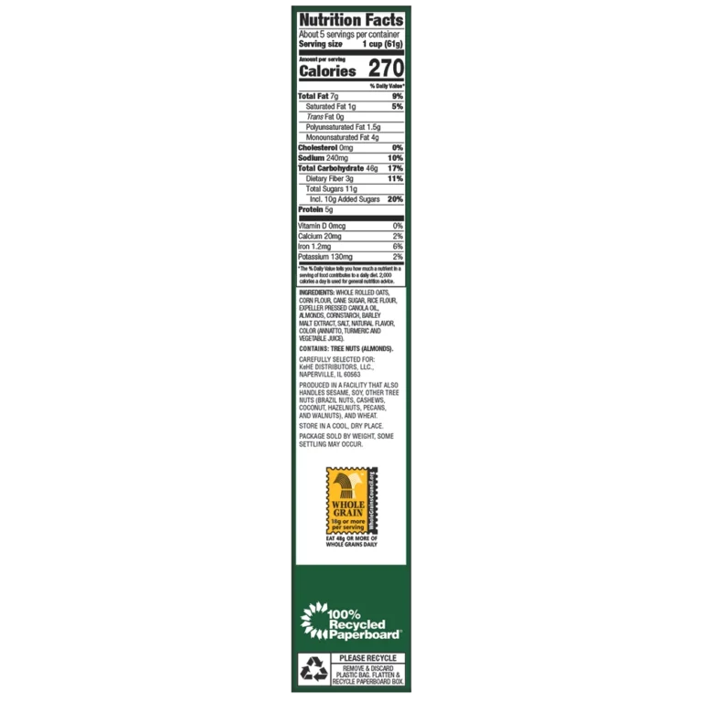 Ingredients: Whole Rolled Oats, Corn Flour, Milled Cane Sugar, Rice Flour, Almonds, Vegetable Oil (Canola and/or Safflower and/or Sunflower Oil), Cornstarch, Brown Rice Syrup, Barley Malt Syrup, Salt, Natural Flavor, Herb Blend (Cinnamon, Ginger, Cardamom, Pepper, Cloves), Color (Annatto, Turmeric and Purple Carrot Juice).