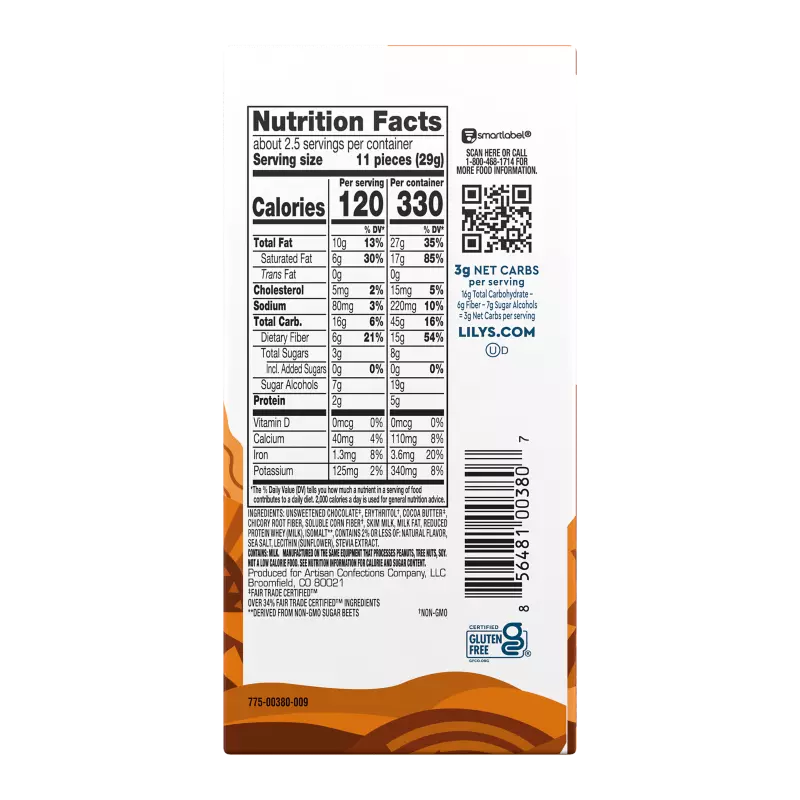 Contains one (1) 2.8-ounce LILY'S Salted Caramel Flavored Milk Chocolate Style No Sugar Added Sweets Bar Give lunch breaks, family dinners, gatherings with friends and conferences with co-workers a delicious boost with a LILY'S Salted Caramel Flavored Milk Chocolate Style sweets bar Kosher certified and gluten free salted caramel flavored milk chocolate style sweets bar that is made with stevia and 36-percent cacao for everyone to enjoy Bring salted caramel flavored milk chocolate style sweetness along to the next birthday party, graduation celebration, retirement send-off, anniversary date or New Year's bash you attend Get salted caramel flavored milk chocolate style confections to go with your Christmas, Valentine's Day, Easter and Halloween candy selections for a sweet and creamy treat perfect for holidays and everyday snacking moments