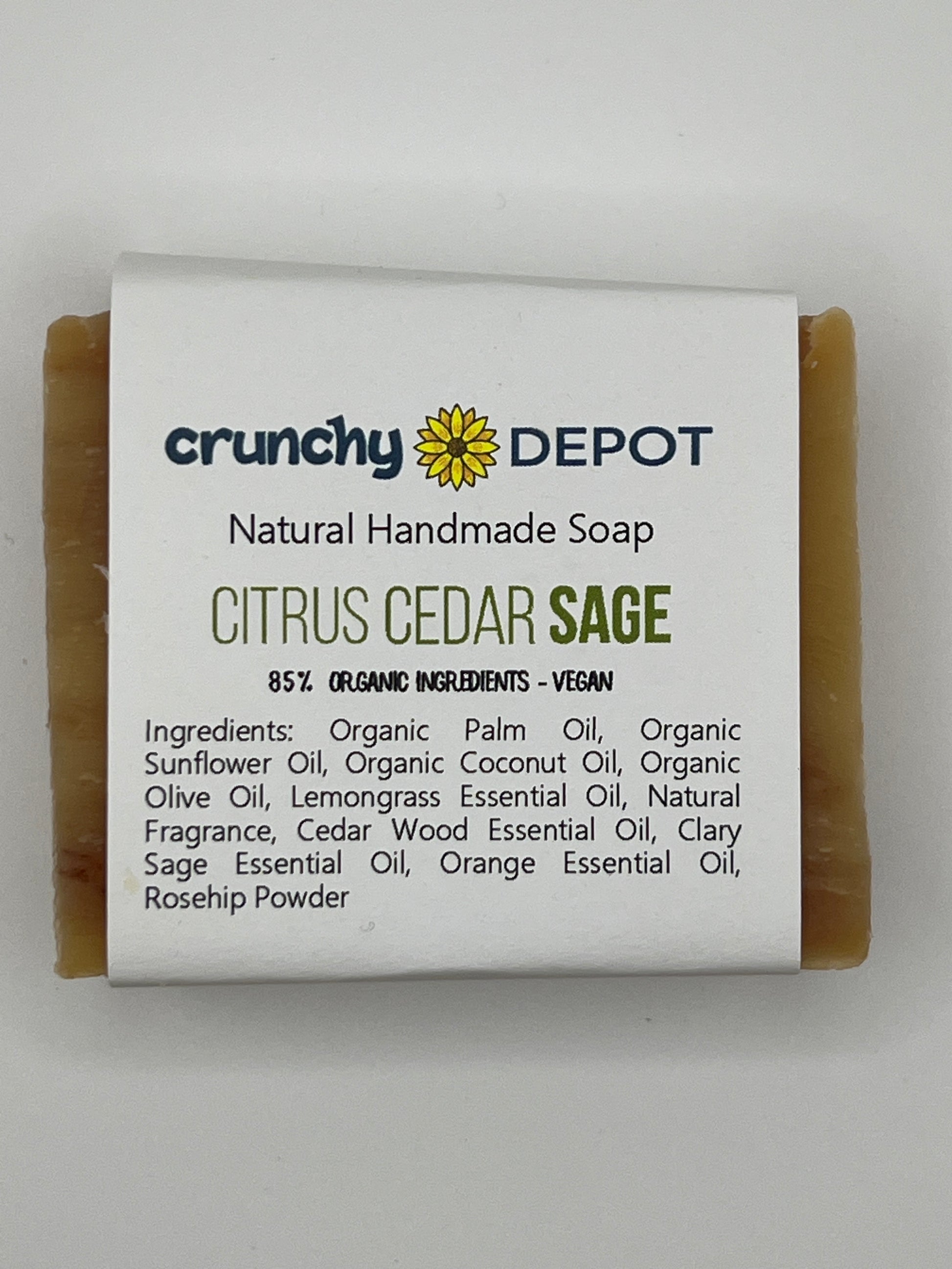 Ingredients: Organic Palm Oil, Organic Sunflower Oil, Organic Coconut Oil, Organic Olive Oil, Lemongrass Essential Oil, Natural Fragrance, Cedar Wood Essential Oil, Clary Sage Essential Oil, Orange Essential Oil, Rosehip Powder