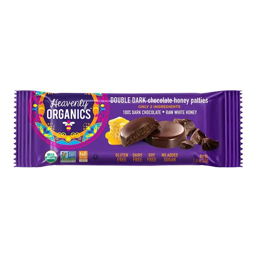 Double the dark, double the yum! Heavenly Organics' 100% Organic Double Dark Chocolate Honey Patties are a blend of velvety, white honey and dark chocolate, enrobed in a 100% cocoa dark chocolate shell. With only two simple ingredients, you're free to indulge…without the guilt.