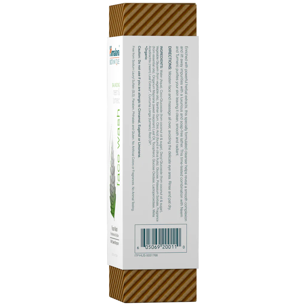 Himalaya Botanique Neem and Turmeric Face Wash brings balance back to your daily cleansing, with gentle, deep-cleaning ingredients. Neem cleans oily skin and helps reduce occasional acne. Turmeric supports clear, healthy-looking skin. Extracts from Vitamin E and Coconut Oil leave your skin feeling soft and moisturized.