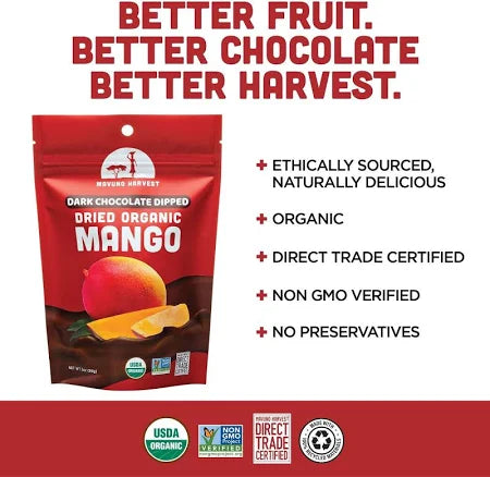 Ingredients: Organic Dried Mango, Organic 50% Dark Chocolate (Organic Cocoa Liquor, Organic Cocoa Butter, Organic Raw Cane Sugar)