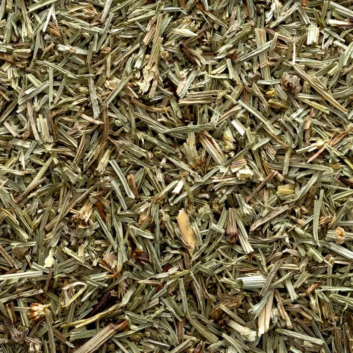 A perennial grass that is dimorphic, having a fertile stem in the spring which dies back and is replaced by a sterile stem in early summer. The fertile stem is brownish in color, shorter and unbranched. The sterile stem is green with whorls of needle-like leaves and jointed stems. Also known as scouring rush, shavegrass, bottlebrush or pewter wort. Our horsetail consists of the sterile, ærial parts harvested in the summer months between June and August.