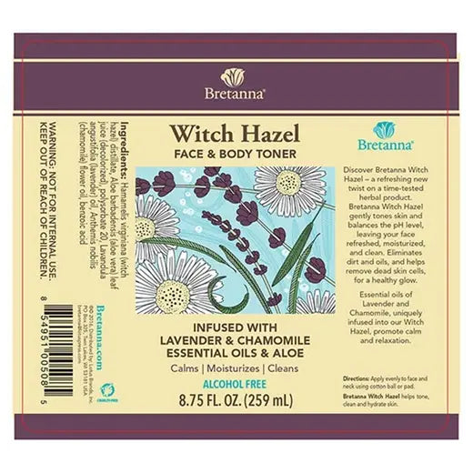 Bretanna Lavender + Chamomile Witch Hazel is produced using true essential oils and contains no fragrance and no alcohol. As an excellent cleansing aid, all-natural witch hazel gently tones skin and balances the pH level, leaving your face refreshed, moisturized and clean. Witch hazel reduces the appearance of blemishes and helps regenerate skin cells for a healthy glow.