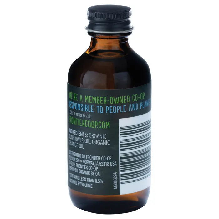 Frontier Co-op Organic Orange Flavor is non-alcoholic and derived from pure orange oil with sunflower oil to help carry and preserve the flavor. Our orange flavor gives a stronger taste to recipes than orange juice and is more convenient than squeezing an orange. Use orange flavor to add brightness to smoothies, cookies, muffins, breads, ice cream, puddings and icings. This item is not available for expedited shipping and must be shipped via ground service.