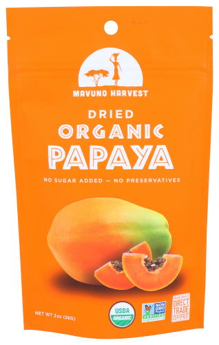 MAVUNO HARVEST ORGANIC DRIED FRUIT IS DRIED PAPAYA ETHICALLY SOURCED FROM AFRICAN FARMERS. EACH 2 OZ. BAG CONTAINS ABOUT 1 ½ SERVINGS OF NON-GMO, NATURALLY SWEET PAPAYA GROWN IN AFRICA. OUR DRIED FRUIT IS PENNSYLVANIA CERTIFIED ORGANIC AND SOCIAL AND FAIR TRADE CERTIFIED BY IMO. MAVUNO HARVEST WAS STARTED BY A PEACE CORPS VOLUNTEER TO HELP SMALL-SCALE RURAL AFRICAN FARMERS AVOID WASTE AND SELL 100% OF THEIR HARVEST. FEED YOUR BODY, FEED THE WORLD.