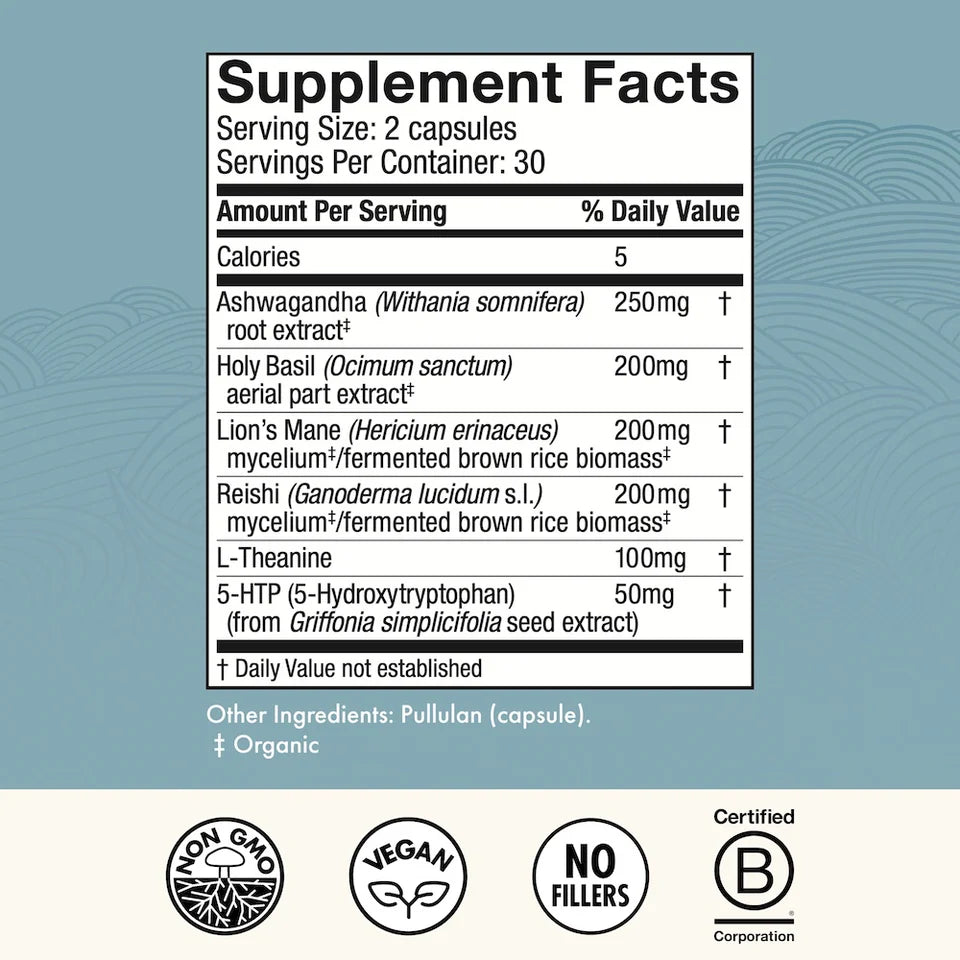 Feeling off-balance, uncentered, or just going through the motions but not really feeling it? Mood is designed to help you find your center by promoting healthy adaptation to stress, a peaceful emotional state, and a balanced mood. Alongside well-known Reishi and Lion’s Mane, this formula combines L-Theanine, 5-HTP, and Holy Basil to promote a calm and relaxed body and mind, adaptation to daily stressors, and supports mood and REM sleep cycles. Mood is the perfect non-sedating formula to add to your mental hygiene routine or self-care checklist.*
