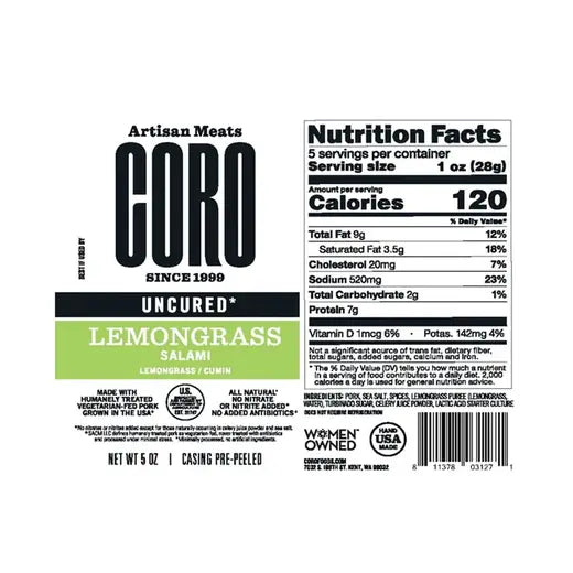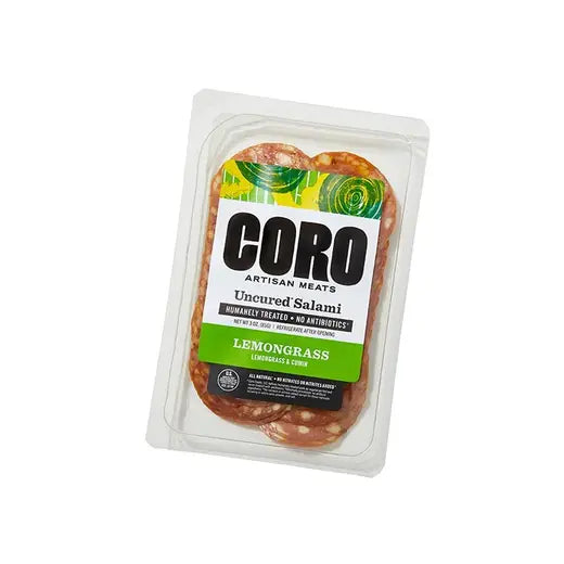 Never before available in sliced, Coro Foods Lemongrass is their top seller when sampled! Inspired with flavors of lemongrass and cumin, you'll be eating this one right out of the package, or making your own salumi sandwiches in no time! Single sliced pack includes 3 ounces of thinly sliced salami and is ready to eat.